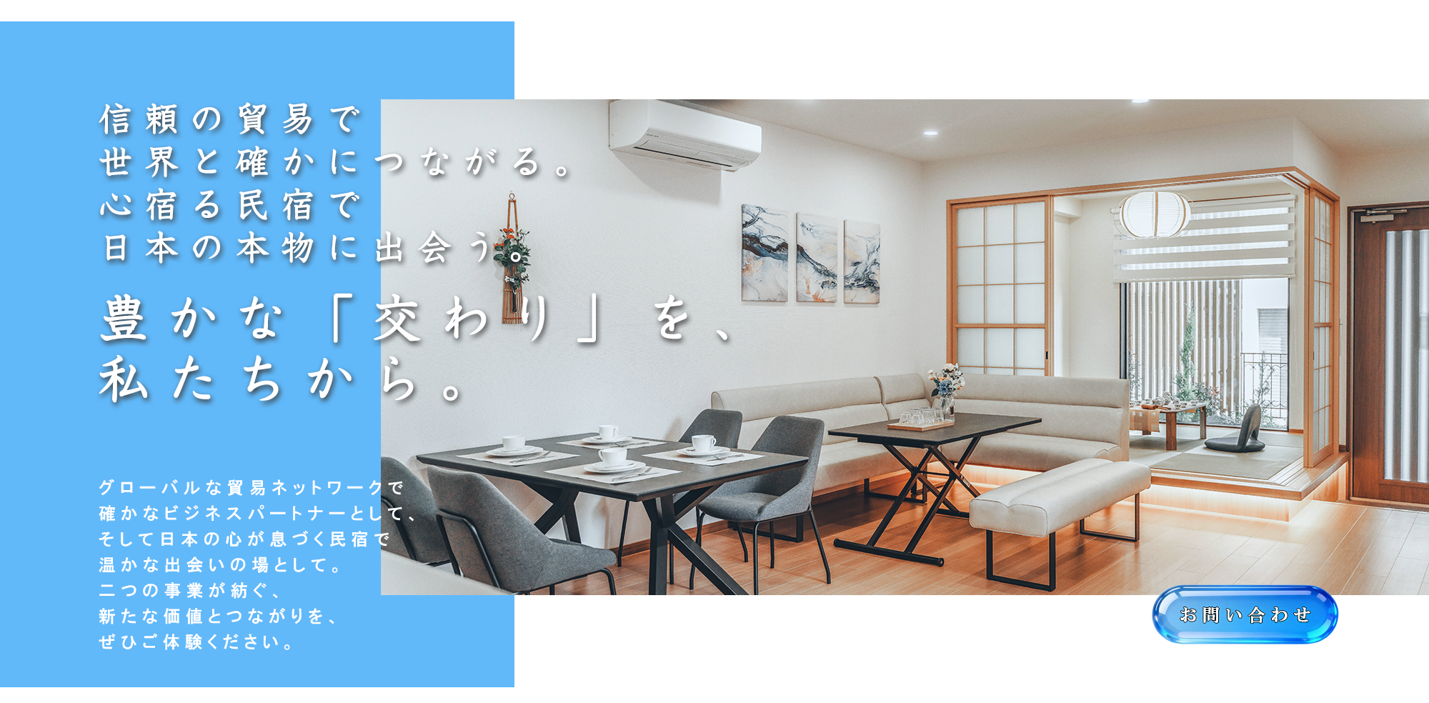 貿易では信頼性の高い商材とスピーディな物流を実現し、民宿では本物の日常と心のこもったおもてなしをご提供します。
